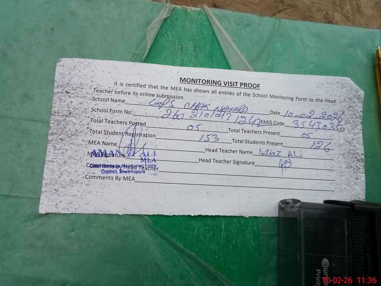 | Monitoring Date: 10-02-2026 | Start Time: 10-02-2026 10:19 AM | End Time: 10-02-2026 11:38 AM | Name of MEA: Am**** Al**** | |