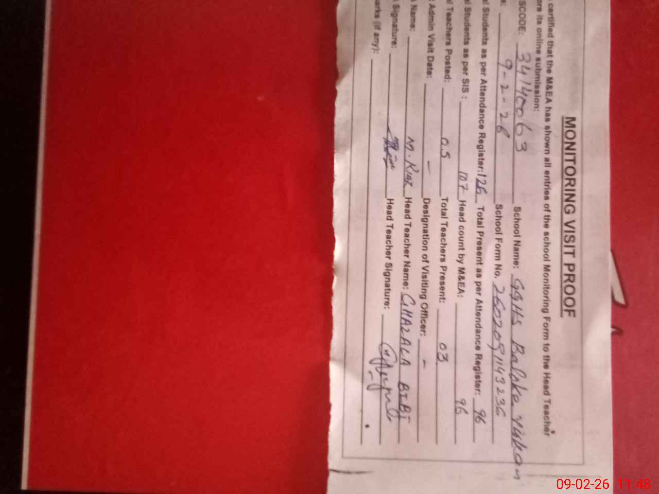| Attendance Register | Head Teacher | MEA with School | Visit Proof |
