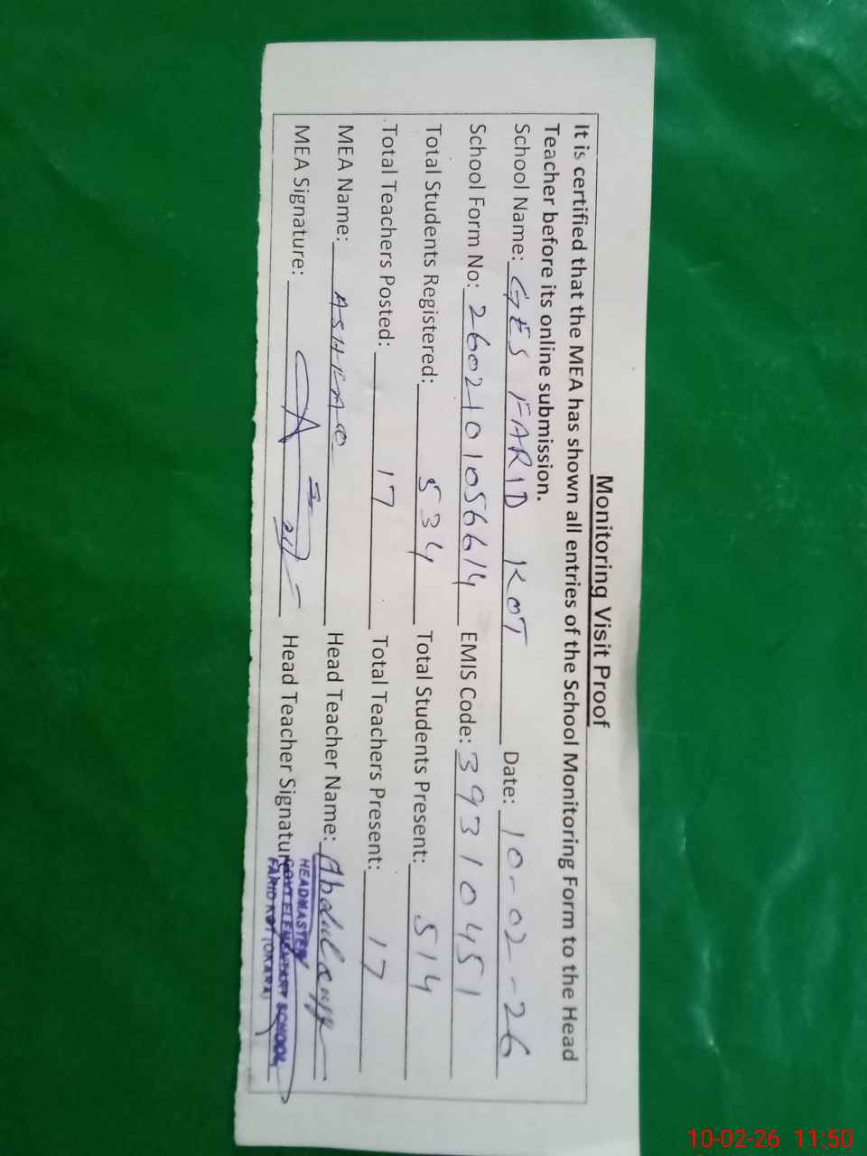 | EMIS Code: 39310451 | Name of School: GES FARID KOT | |||