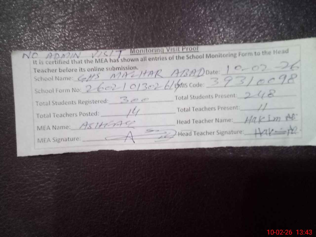 | Certified that this School was Inspected by the Undersigned MEA/DMO Today and the Information Stated Above is as Per Record. | |||||