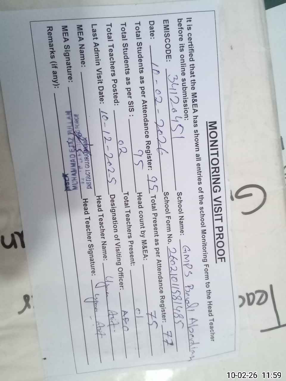 | Certified that this School was Inspected by the Undersigned MEA/DMO Today and the Information Stated Above is as Per Record. | |||||