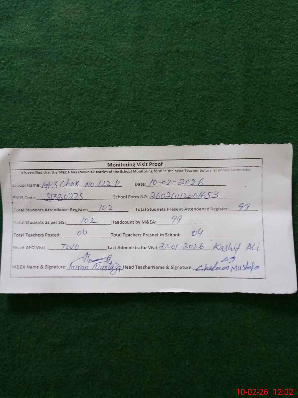| EMIS Code: 31330275 | Name of School: GPS CHAK NO. 122/P | |||