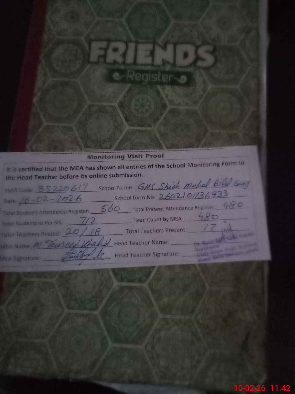 | Attendance Register | Head Teacher | MEA with School | Visit Proof |