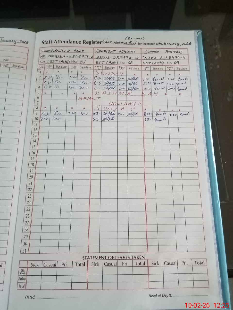 | CNIC | Full Name | Designation | R/C | Absence During Last Calender Month |