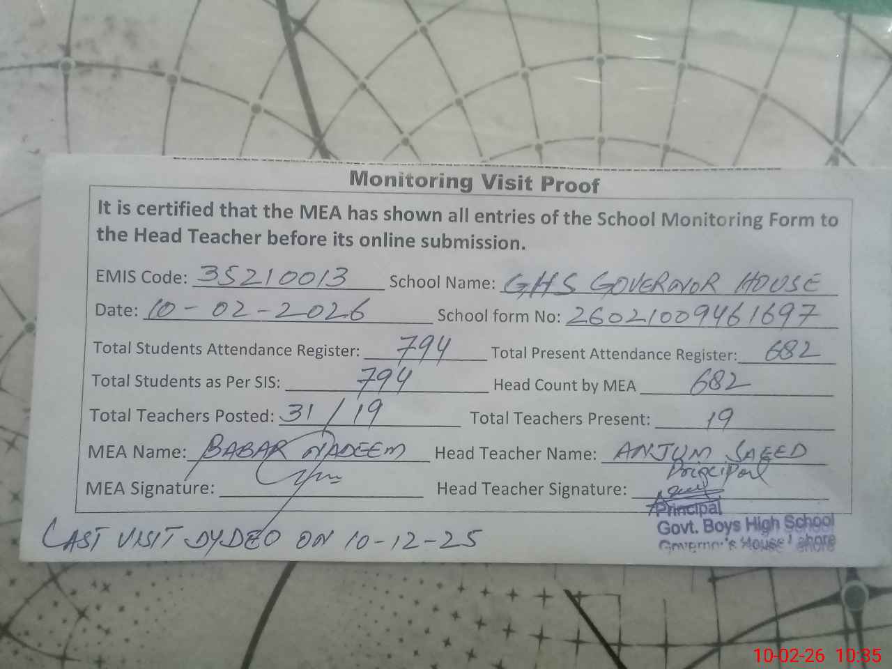 | EMIS Code: 35210013 | Name of School: GHS GOVERNOR HOUSE LAHORE | |||