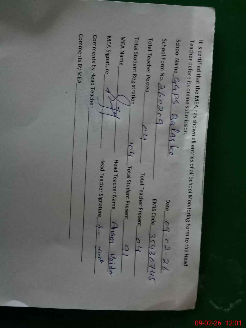 | Certified that this School was Inspected by the Undersigned MEA/DMO Today and the Information Stated Above is as Per Record. | |||||