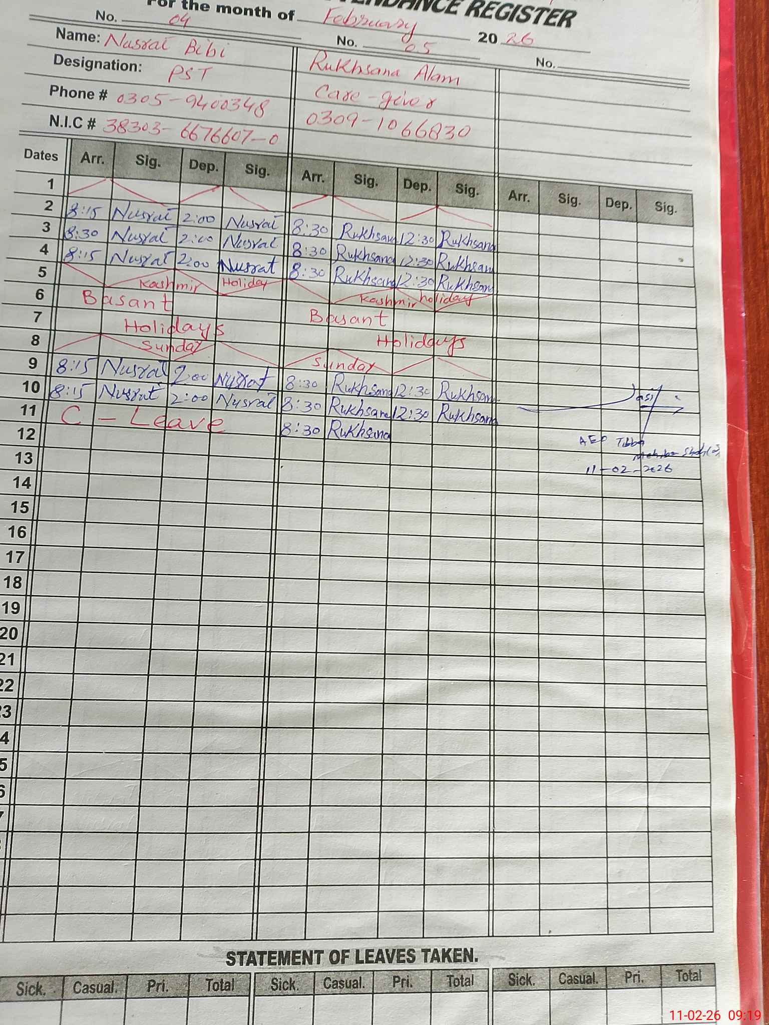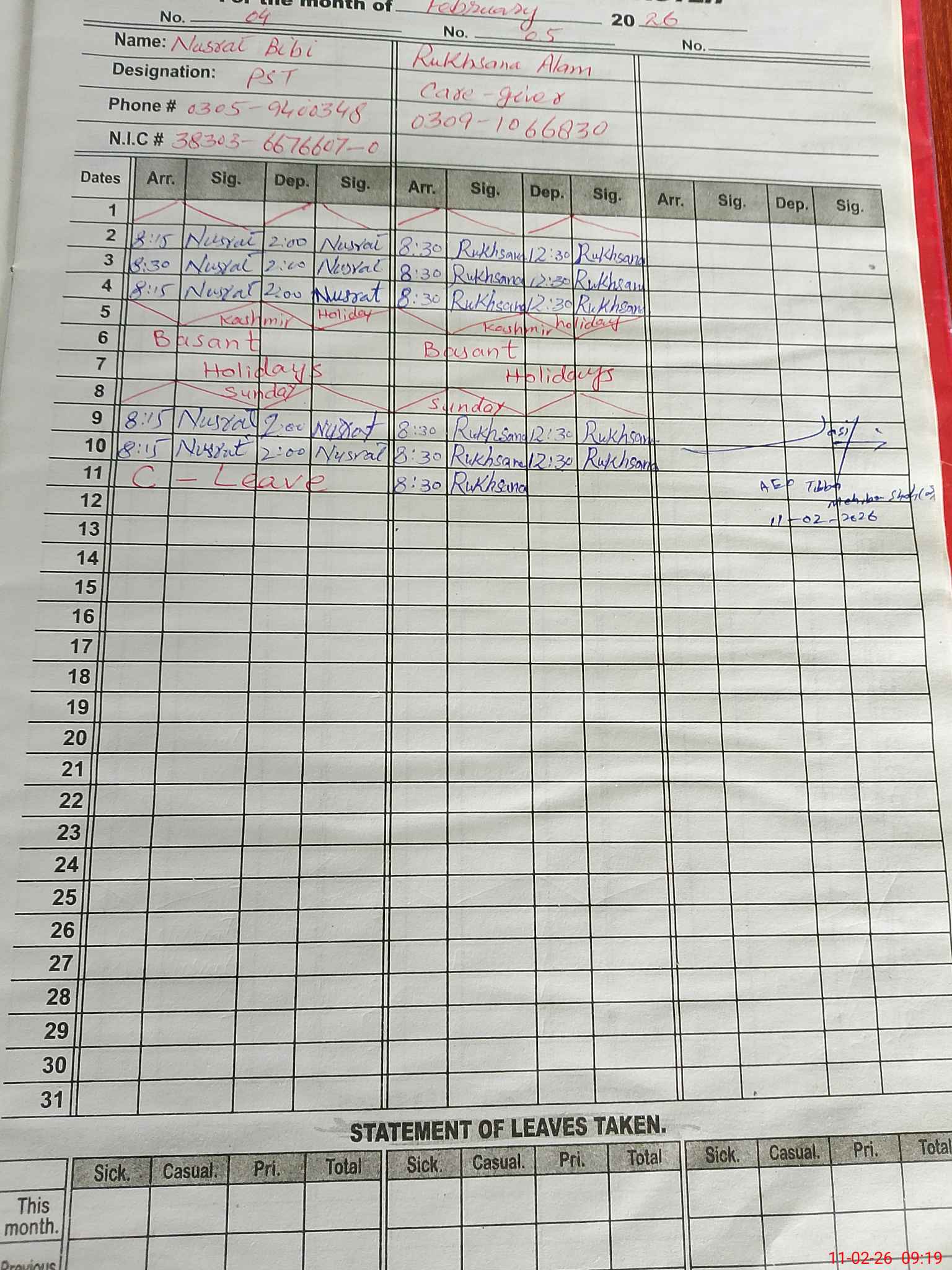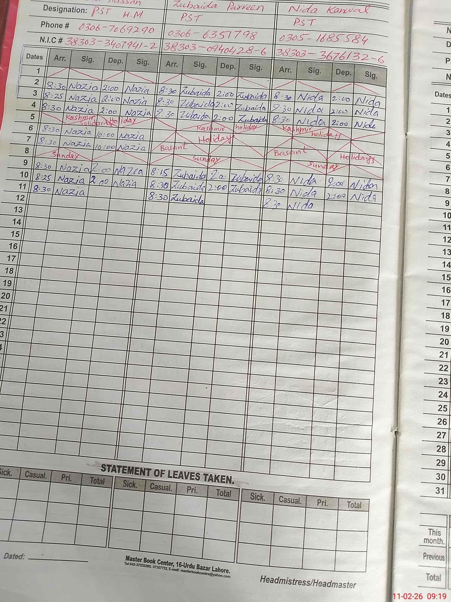 | CNIC | Full Name | Designation | R/C | Absence During Last Calender Month |