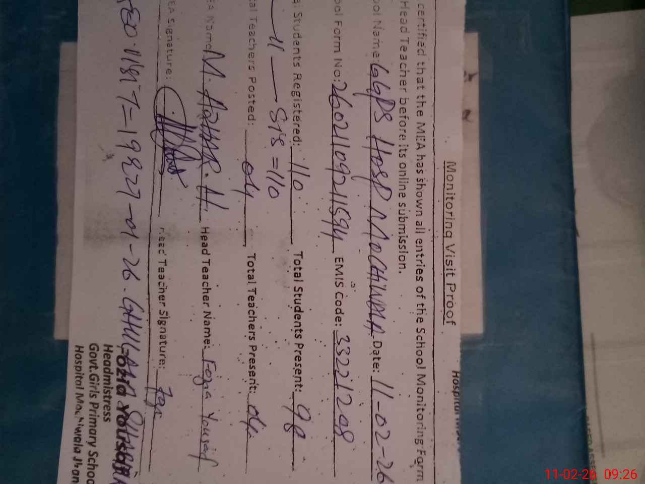 | EMIS Code: 33221208 | Name of School: GGPS HOSPITAL MOCHI WALA | |||