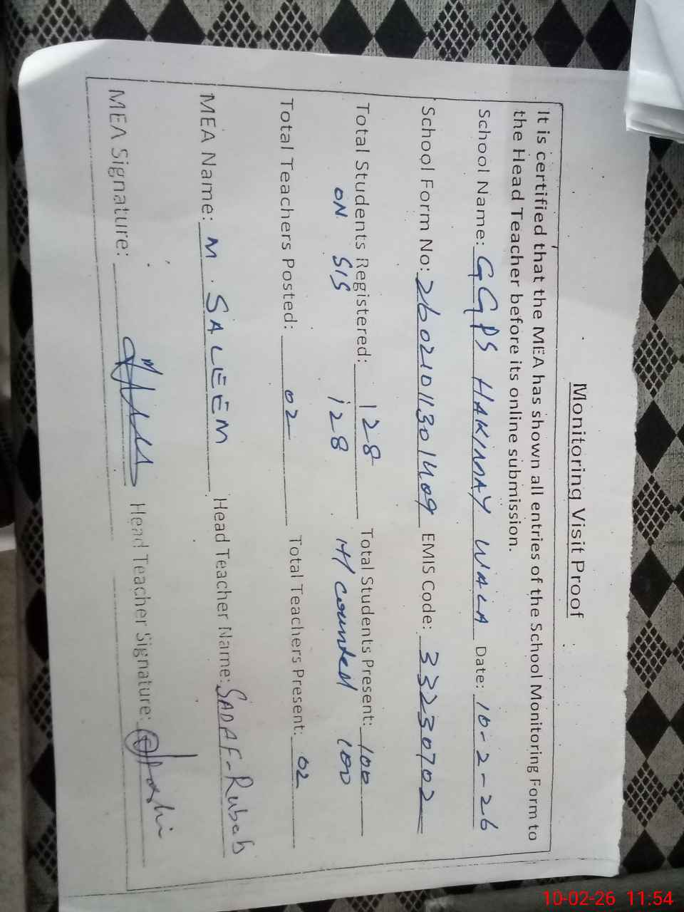 | EMIS Code: 33230702 | Name of School: GGPS HAKIMAY WALA | |||