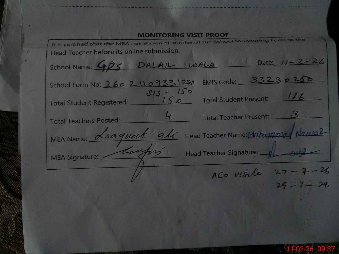 | EMIS Code: 33230250 | Name of School: GPS DALAIL WALA | |||