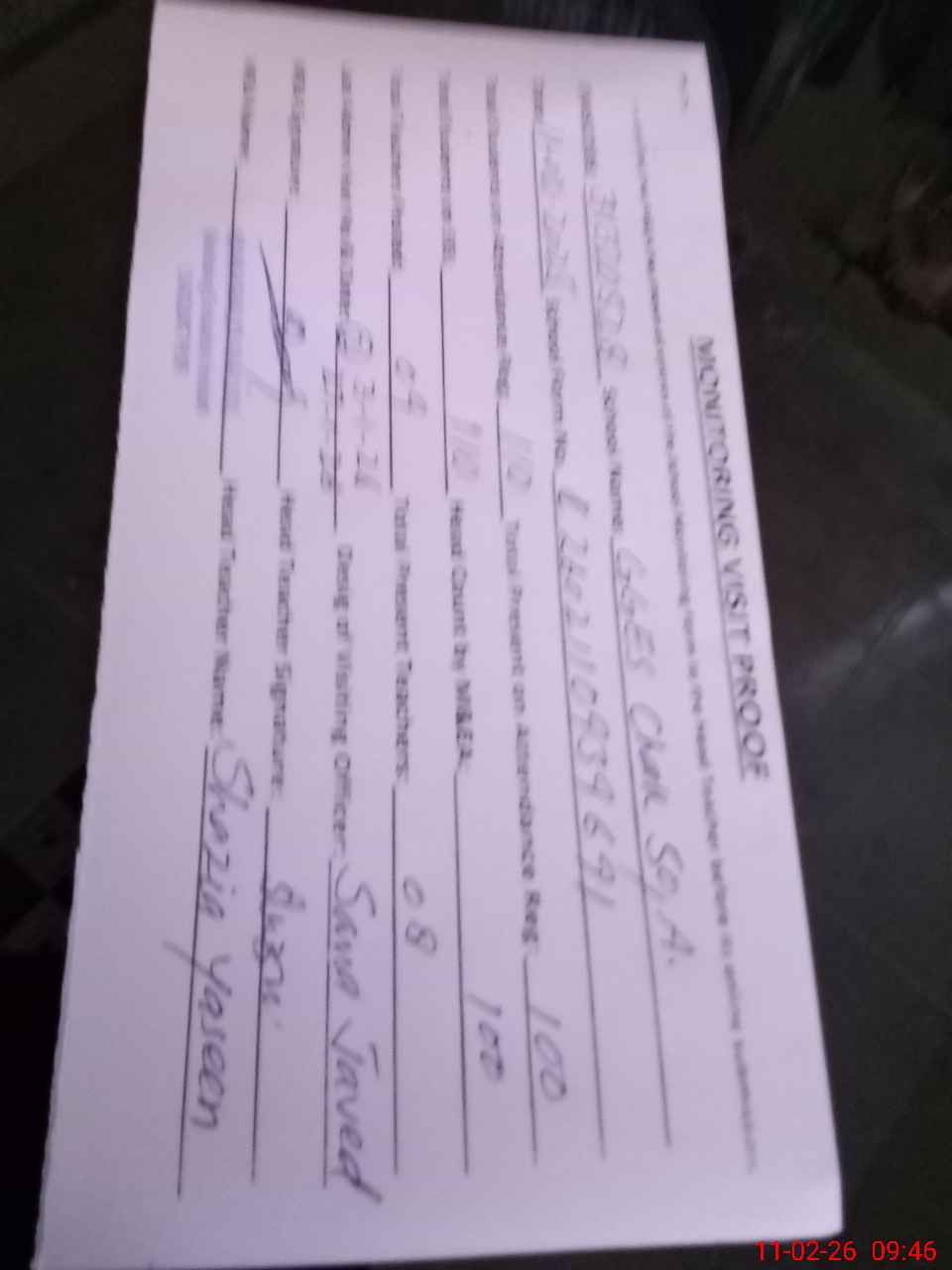 | Attendance Register | Head Teacher | MEA with School | Visit Proof |