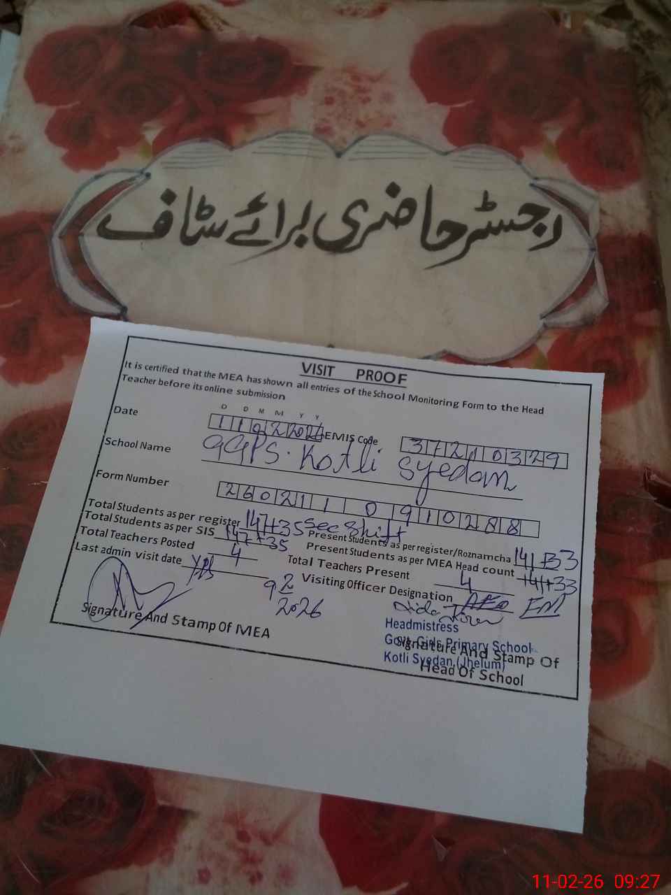 | Attendance Register | Head Teacher | MEA with School | Visit Proof |