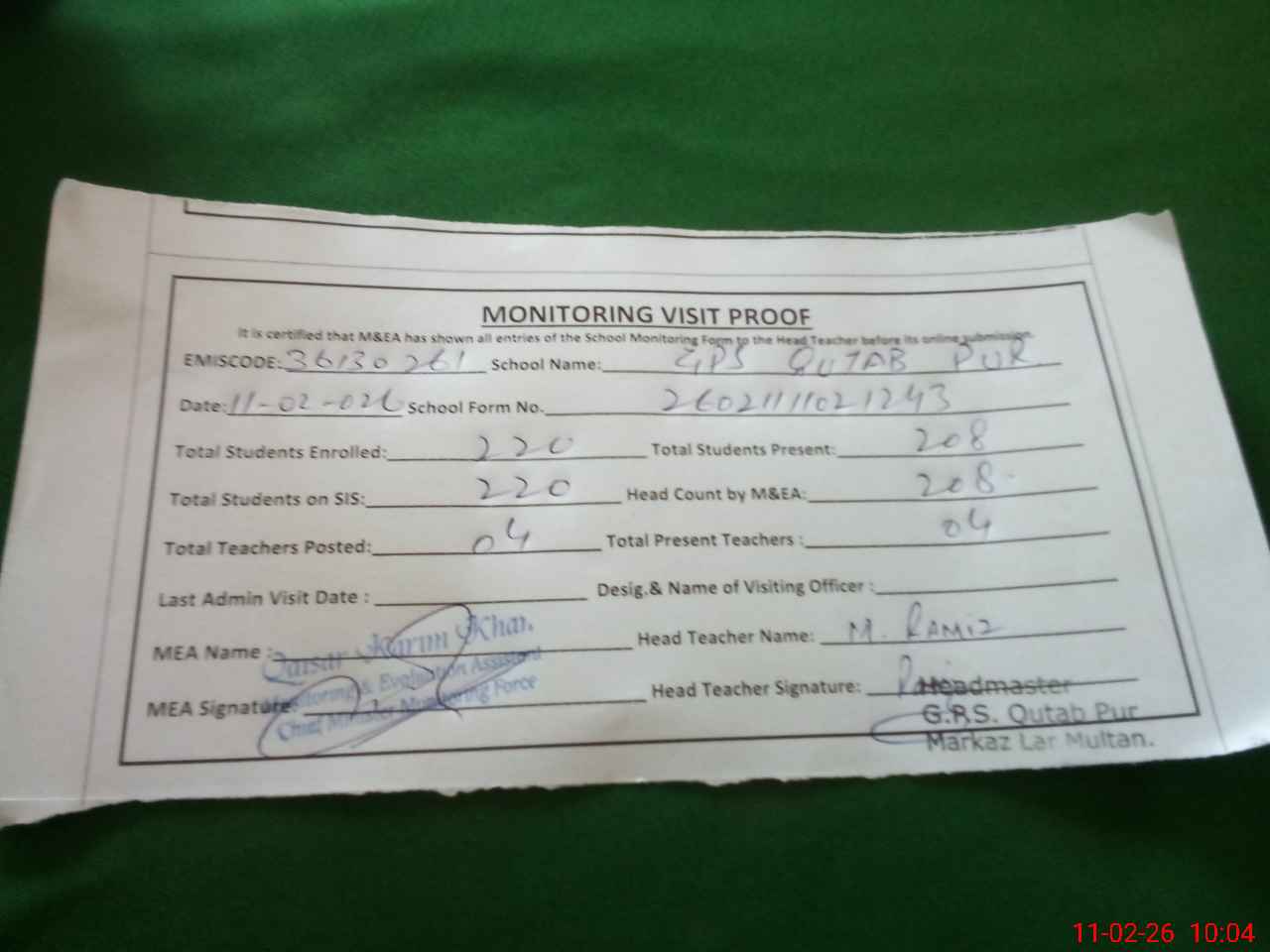 | EMIS Code: 36130261 | Name of School: GPS QUTAB PUR | |||