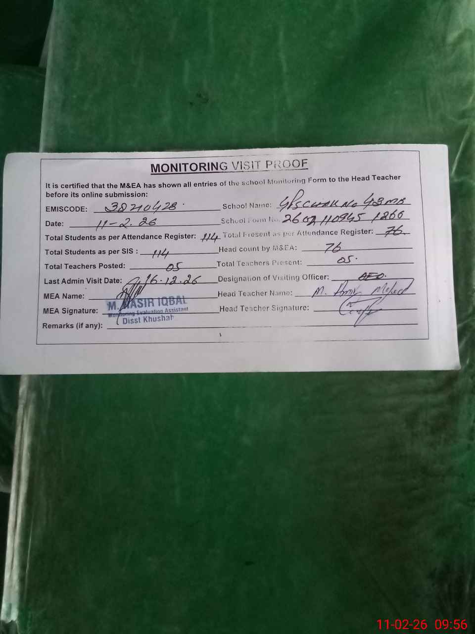 | Attendance Register | Head Teacher | MEA with School | Visit Proof |