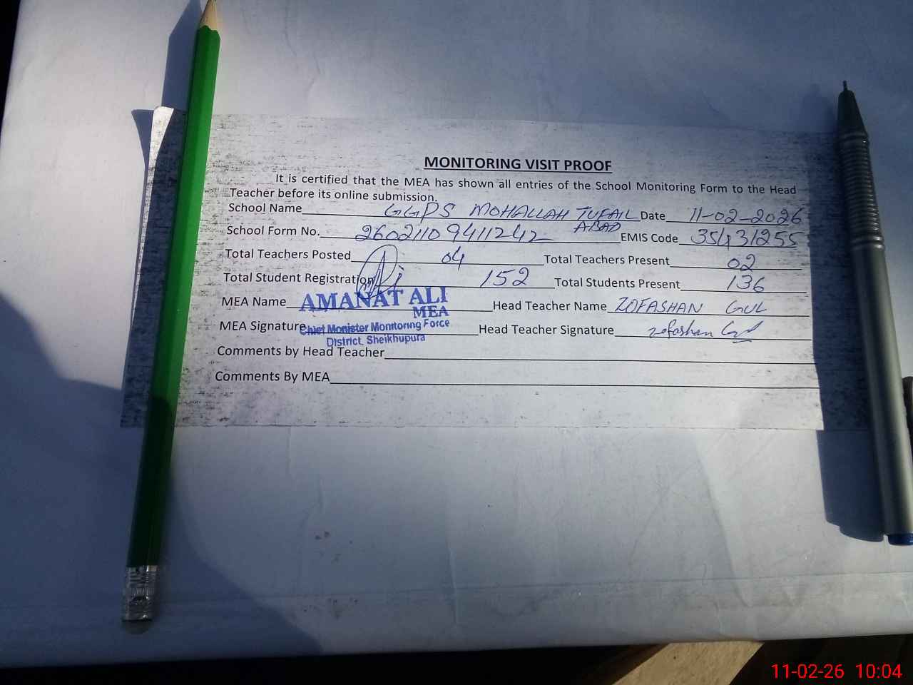 | Attendance Register | Head Teacher | MEA with School | Visit Proof |