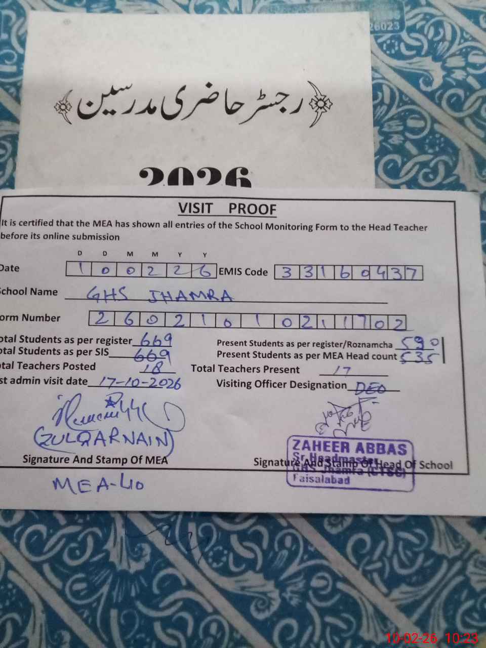 | Attendance Register | Head Teacher | MEA with School | Visit Proof |