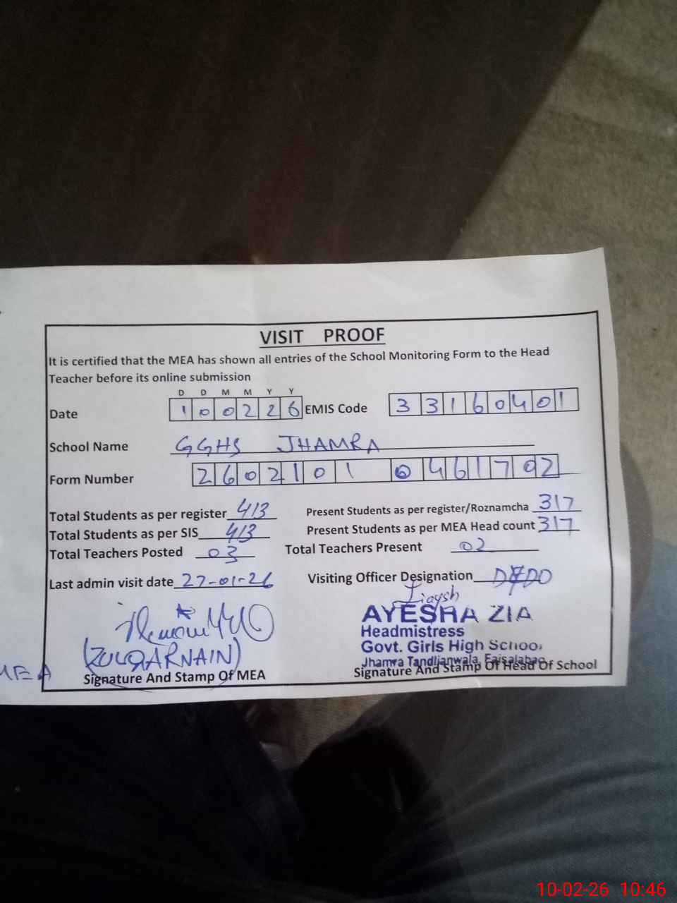 | Certified that this School was Inspected by the Undersigned MEA/DMO Today and the Information Stated Above is as Per Record. | |||||