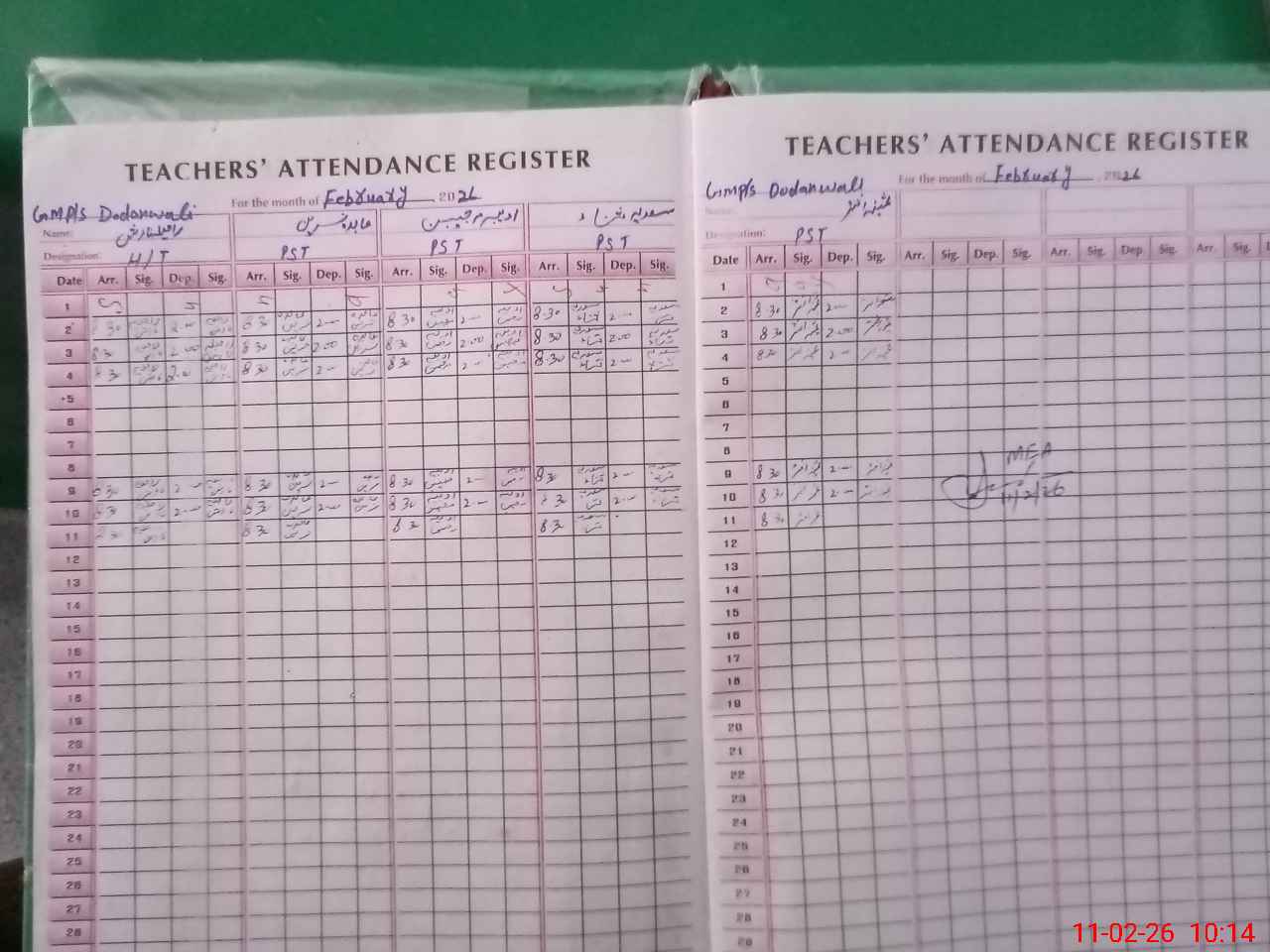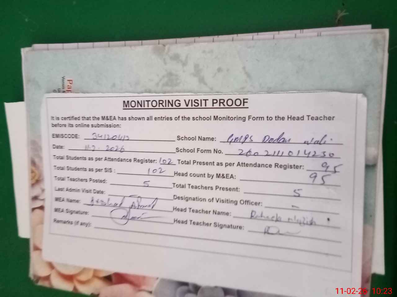 | Attendance Register | Head Teacher | MEA with School | Visit Proof |