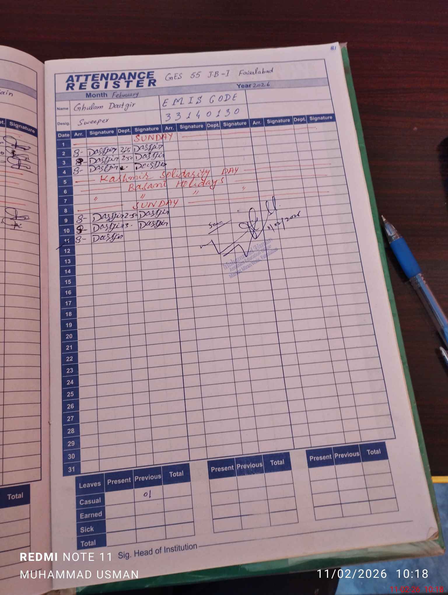 | Name: MU**** IS**** WA**** Designation: (School Headmaster's/Headmistress's) EST (G) Phone/Cell Number: 03**** |