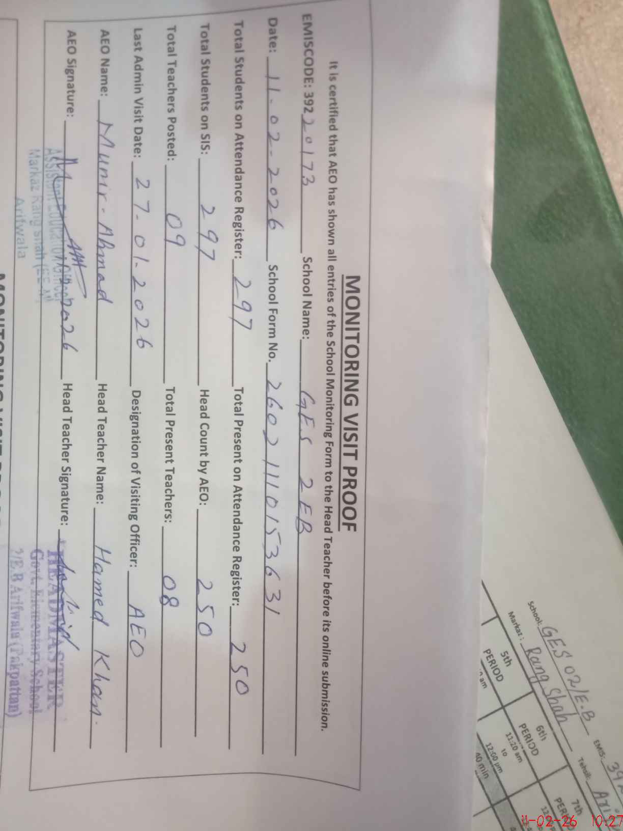 | Attendance Register | Head Teacher | MEA with School | Visit Proof |