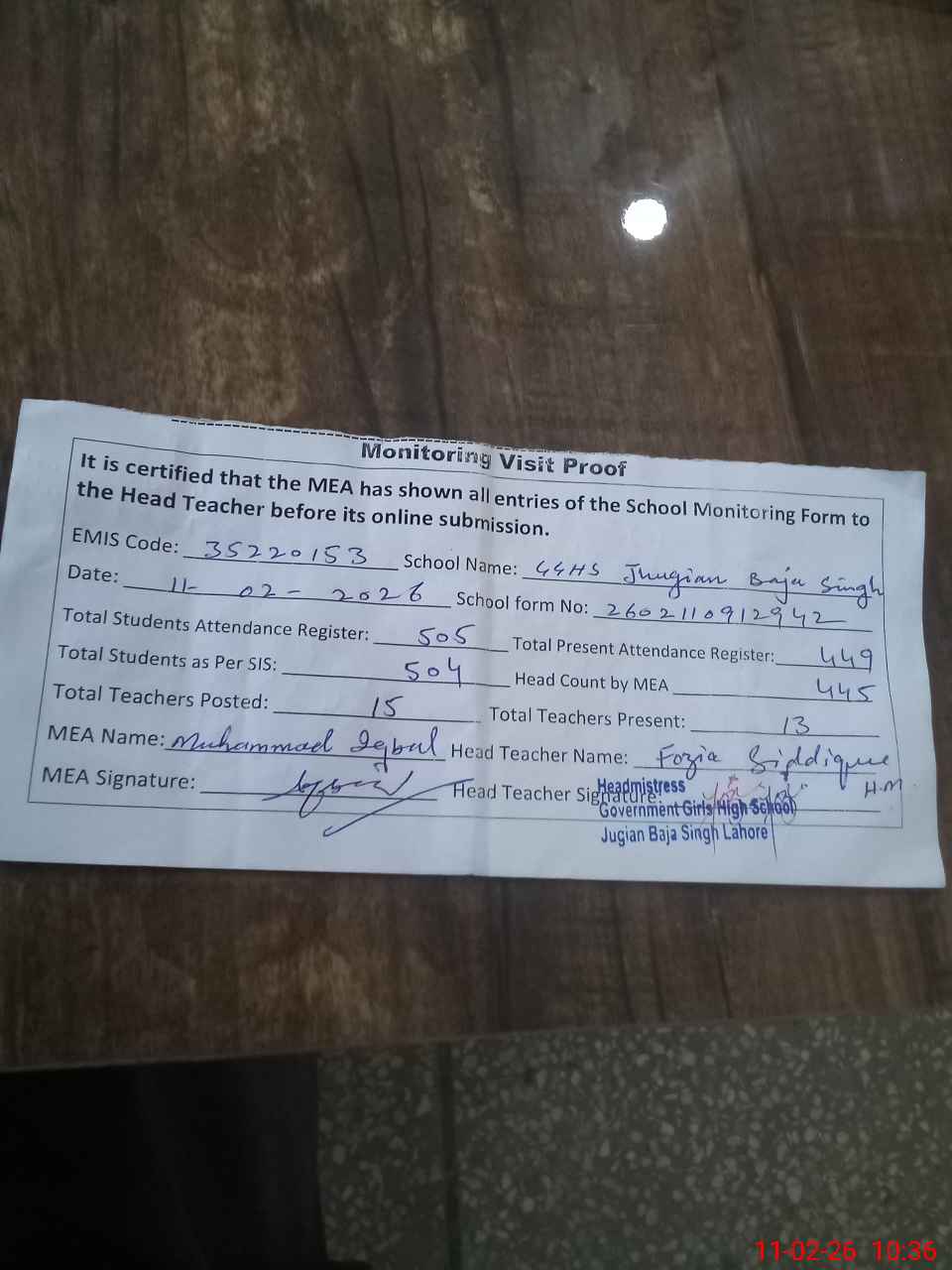 | Attendance Register | Head Teacher | MEA with School | Visit Proof |