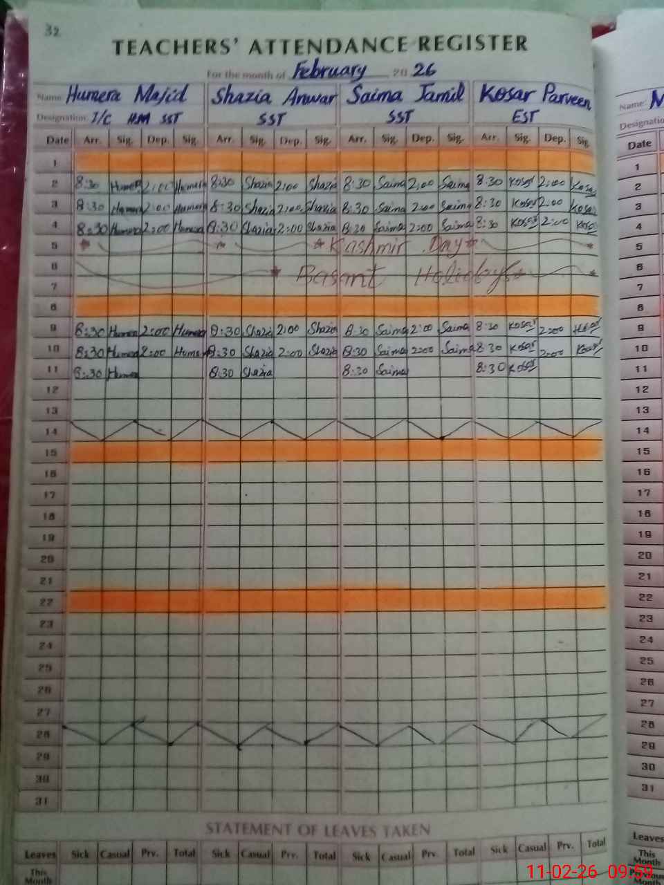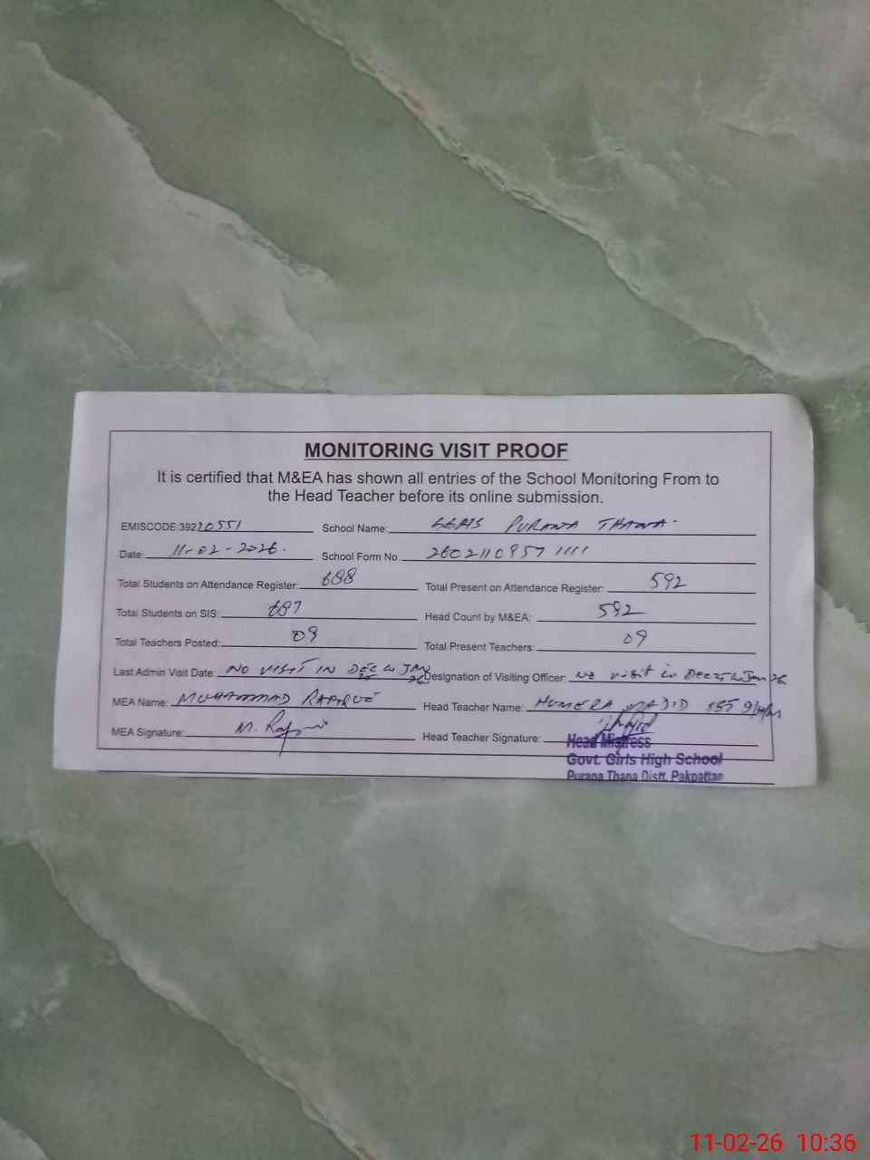 | Attendance Register | Head Teacher | MEA with School | Visit Proof |