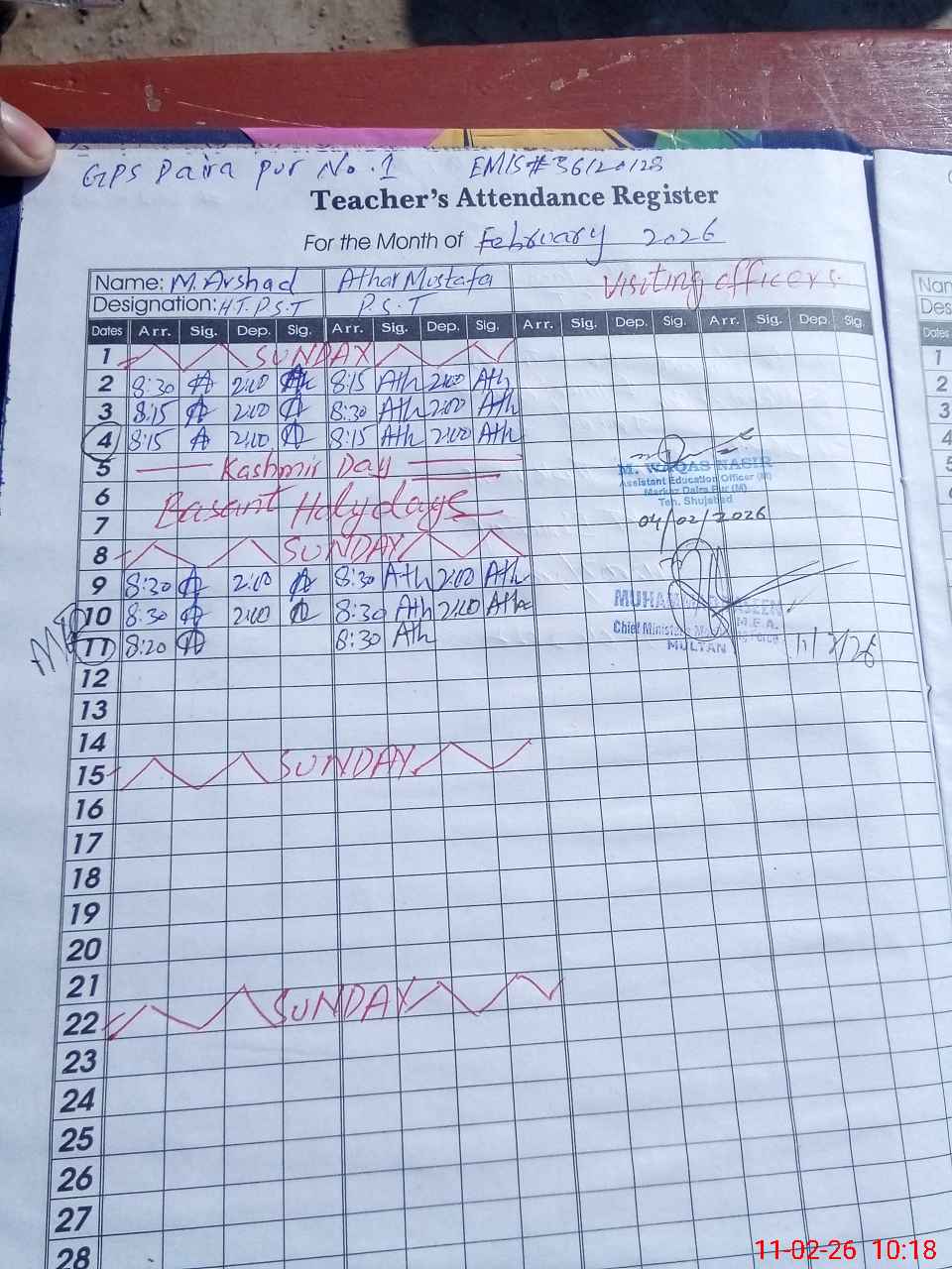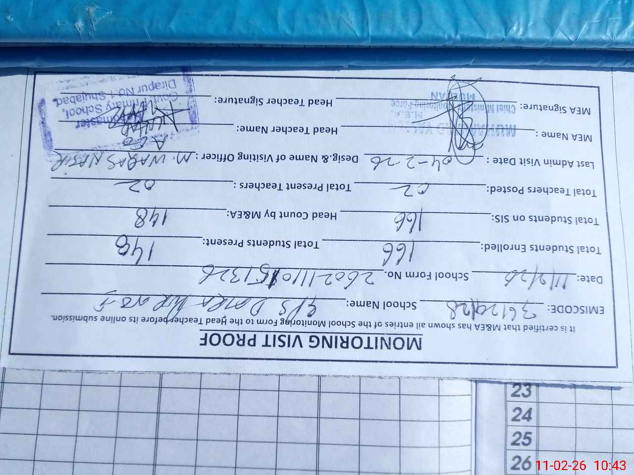 | Attendance Register | Head Teacher | MEA with School | Visit Proof |
