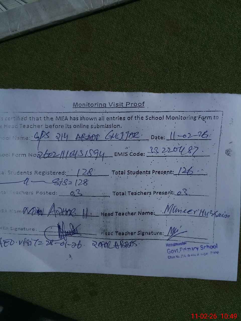 | EMIS Code: 33220487 | Name of School: GPS CHAK NO 214 ABADI JB GUJAR | |||