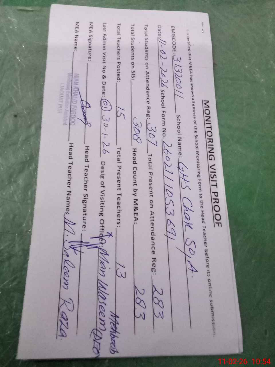 | Monitoring Date: 11-02-2026 | Start Time: 11-02-2026 09:58 AM | End Time: 11-02-2026 10:55 AM | Name of MEA: Kh**** Fa**** | |
