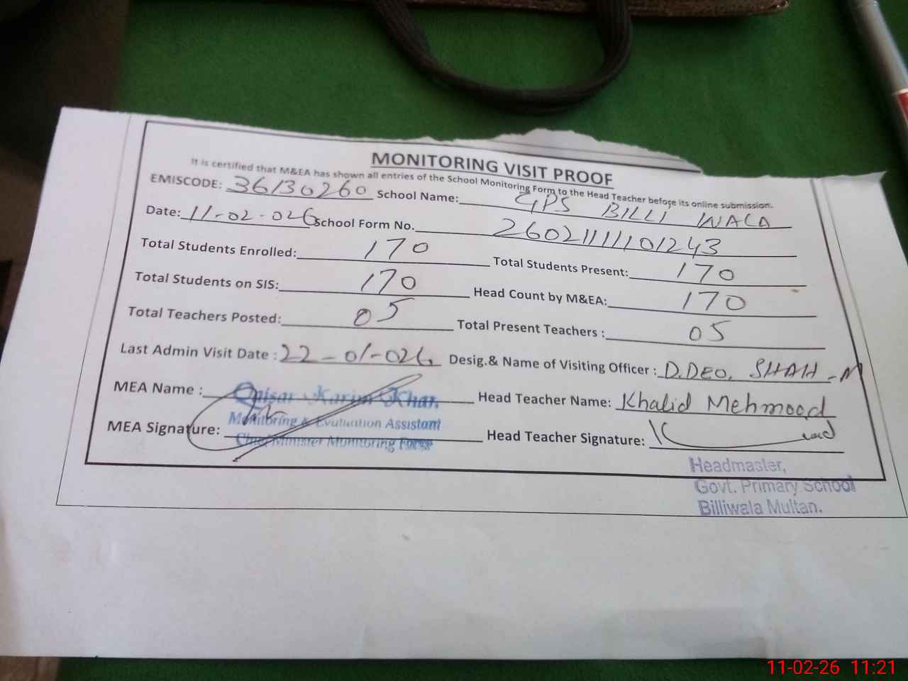 | Attendance Register | Head Teacher | MEA with School | Visit Proof |