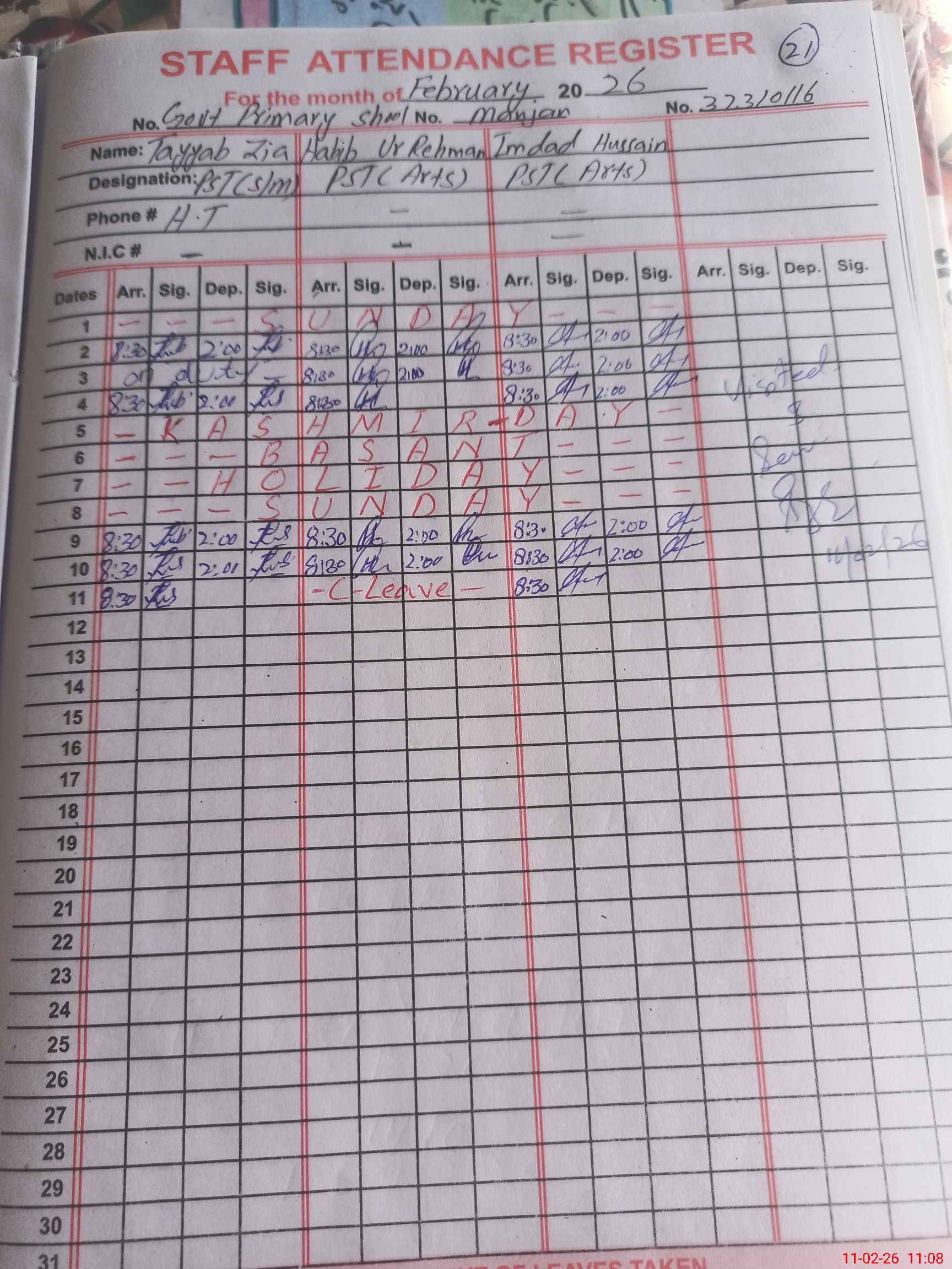 | CNIC | Full Name | Designation | R/C | Absence During Last Calender Month |