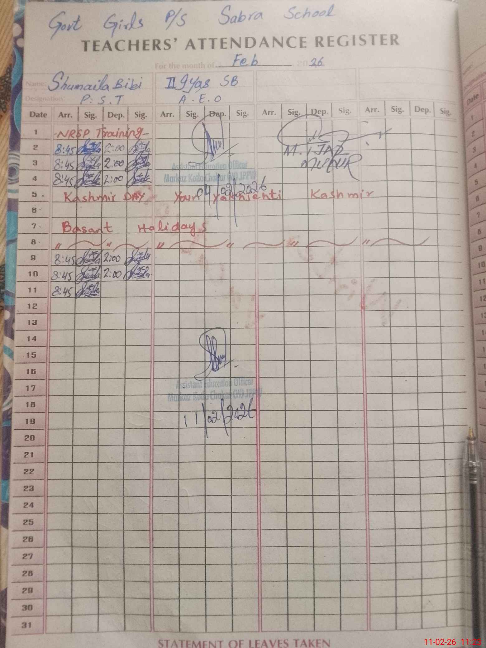 | Name: Sh**** Bi**** Designation: (School Headmaster's/Headmistress's) PST Phone/Cell Number: 03**** |