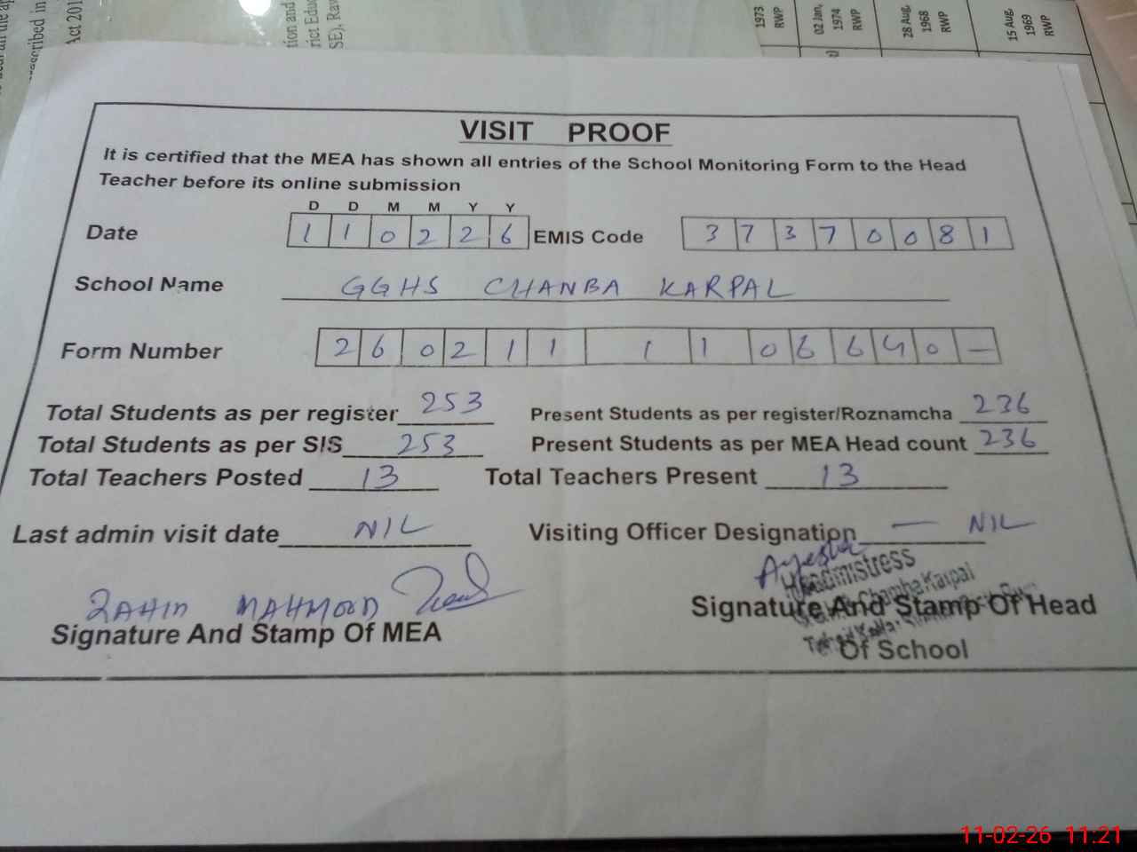 | Attendance Register | Head Teacher | MEA with School | Visit Proof |
