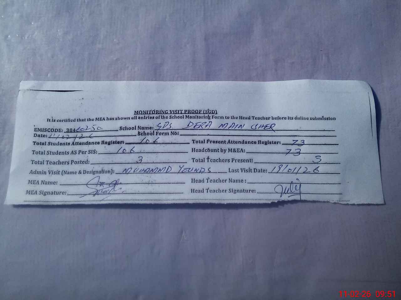 | Attendance Register | Head Teacher | MEA with School | Visit Proof |