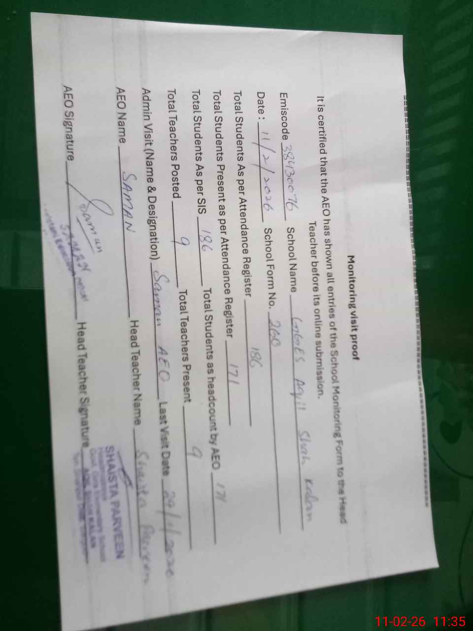 | Attendance Register | Head Teacher | MEA with School | Visit Proof |
