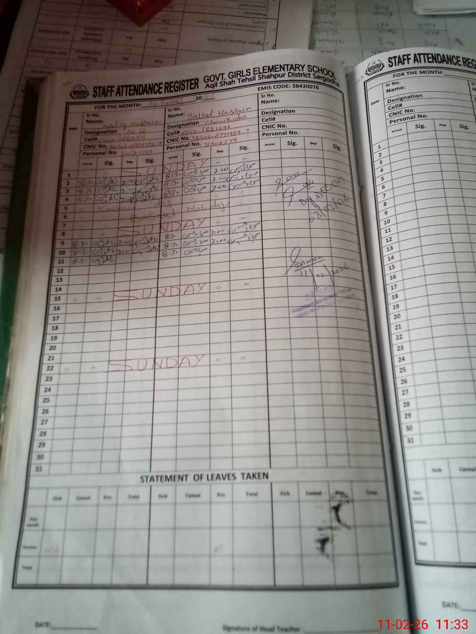 | Name: SH**** PA**** Designation: (School Headmaster's/Headmistress's) SST ART Phone/Cell Number: 03**** |