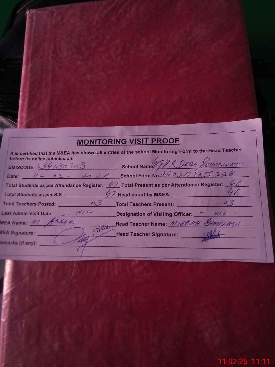 | Attendance Register | Head Teacher | MEA with School | Visit Proof |