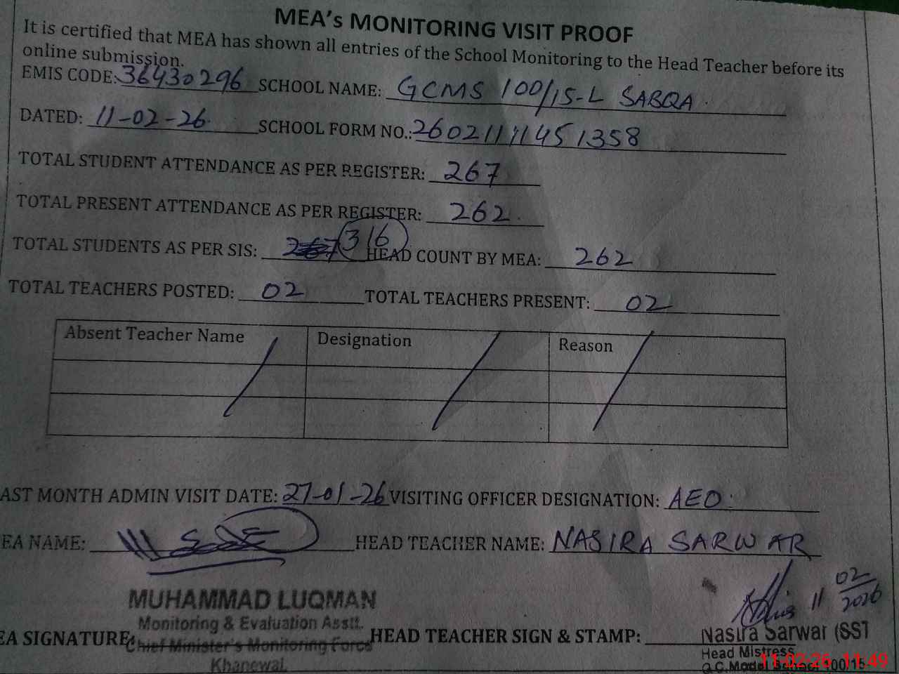 | EMIS Code: 36430296 | Name of School: GCMS 100/15-L SABQA, MIAN CHANNU | |||