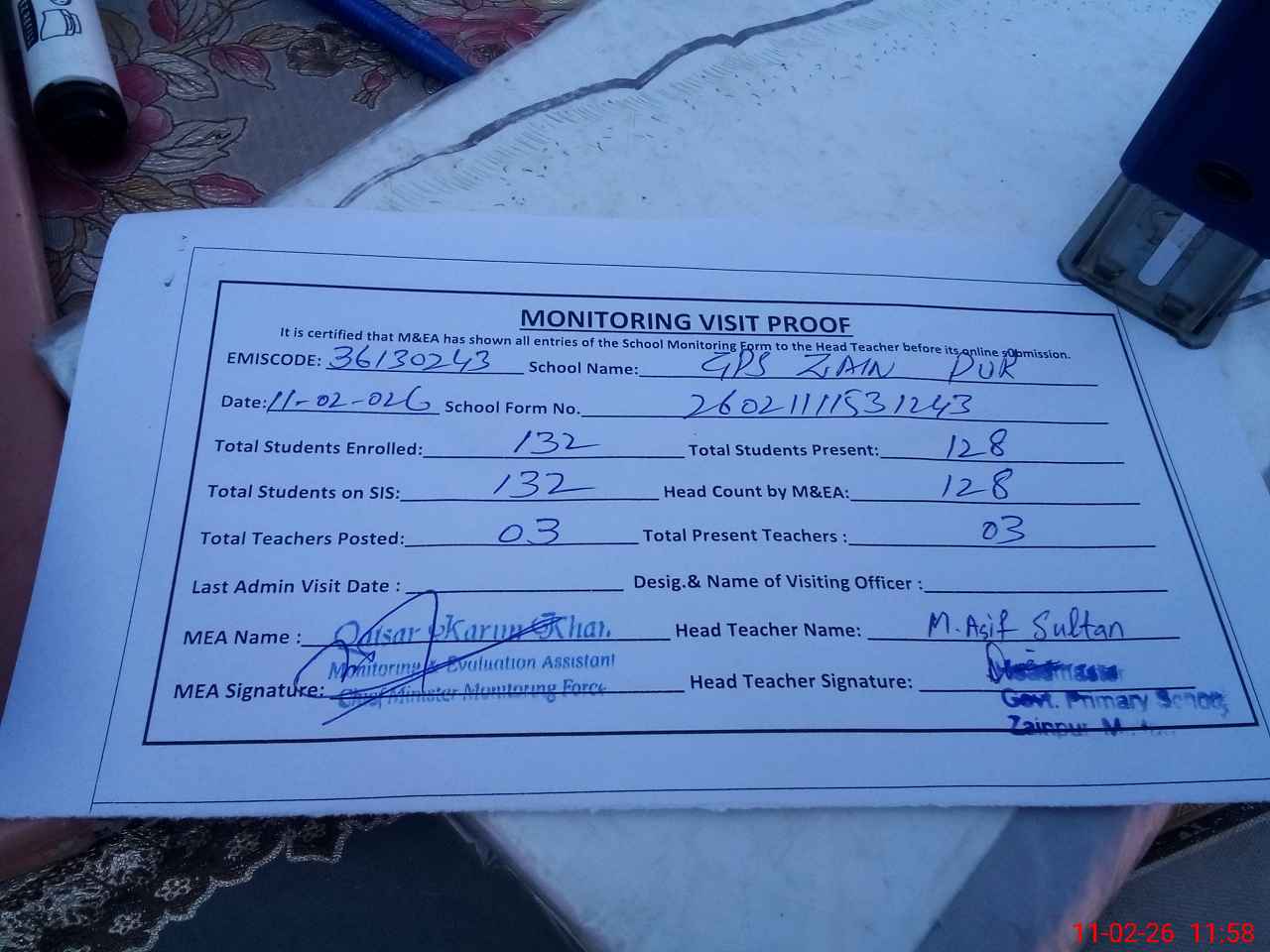 | Attendance Register | Head Teacher | MEA with School | Visit Proof |