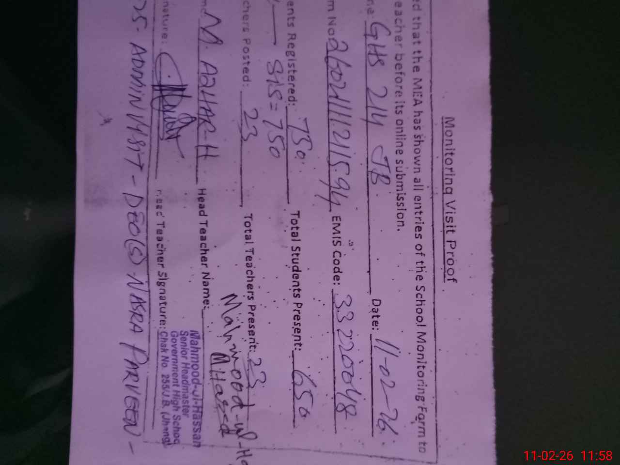 | Attendance Register | Head Teacher | MEA with School | Visit Proof |