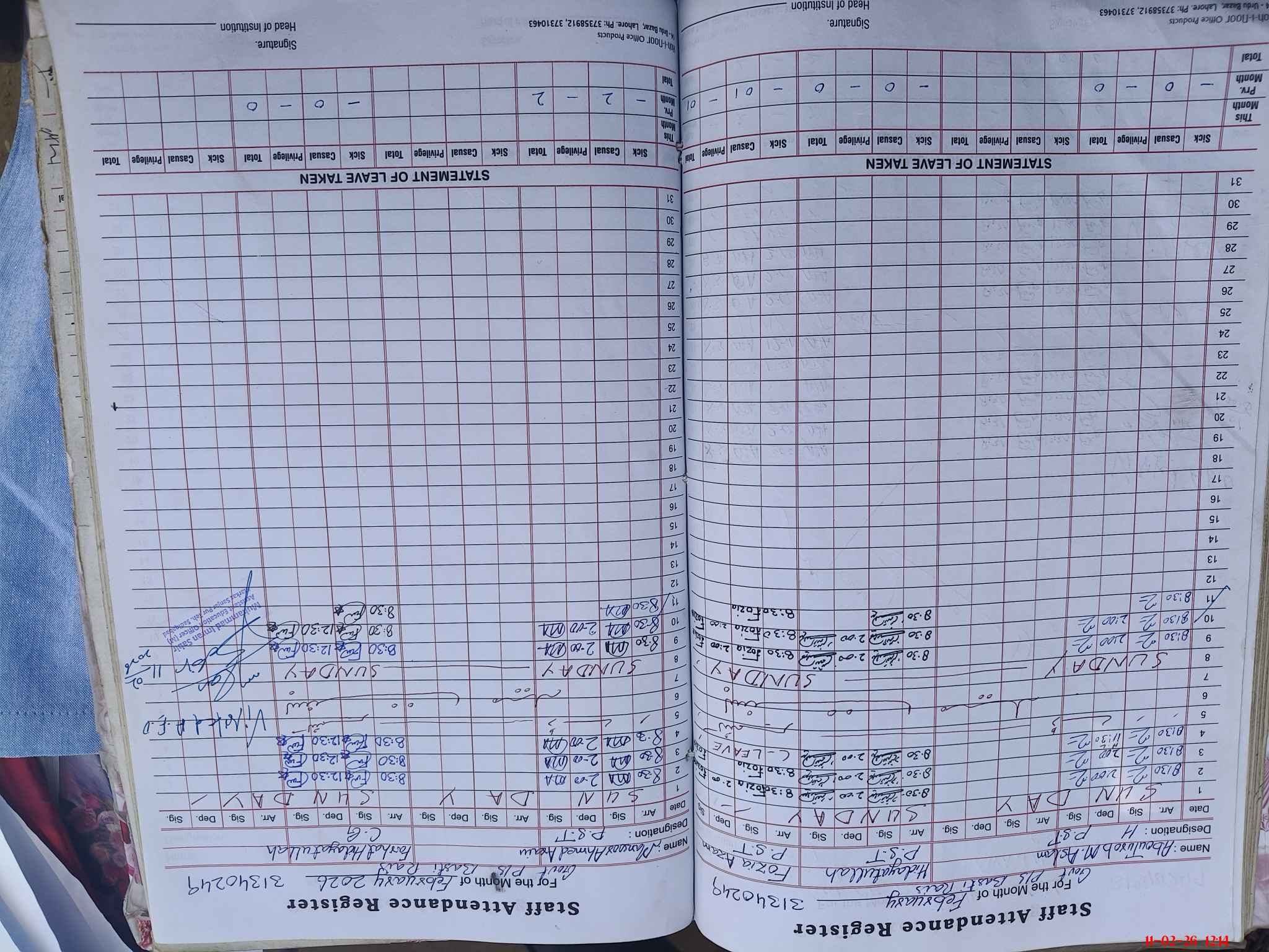 | CNIC | Full Name | Designation | R/C | Absence During Last Calender Month |