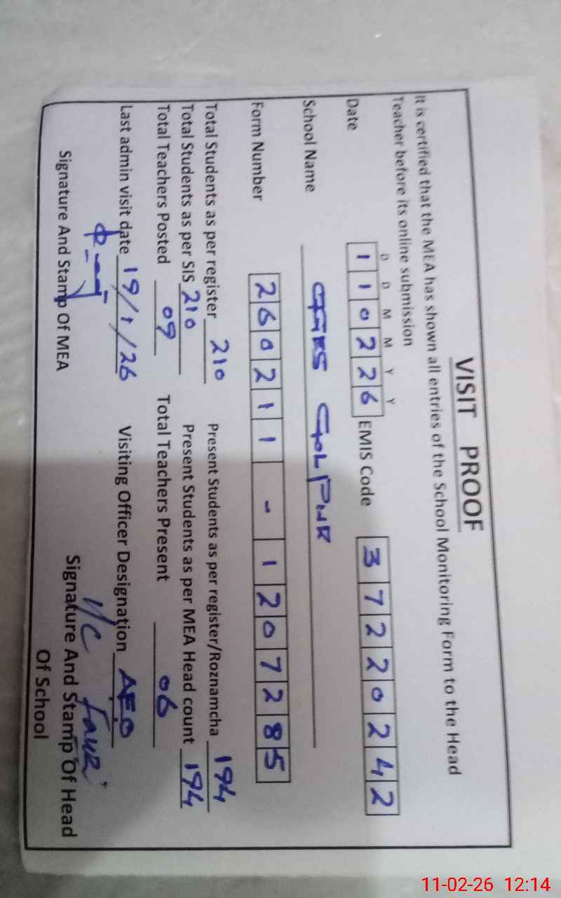 | Certified that this School was Inspected by the Undersigned MEA/DMO Today and the Information Stated Above is as Per Record. | |||||