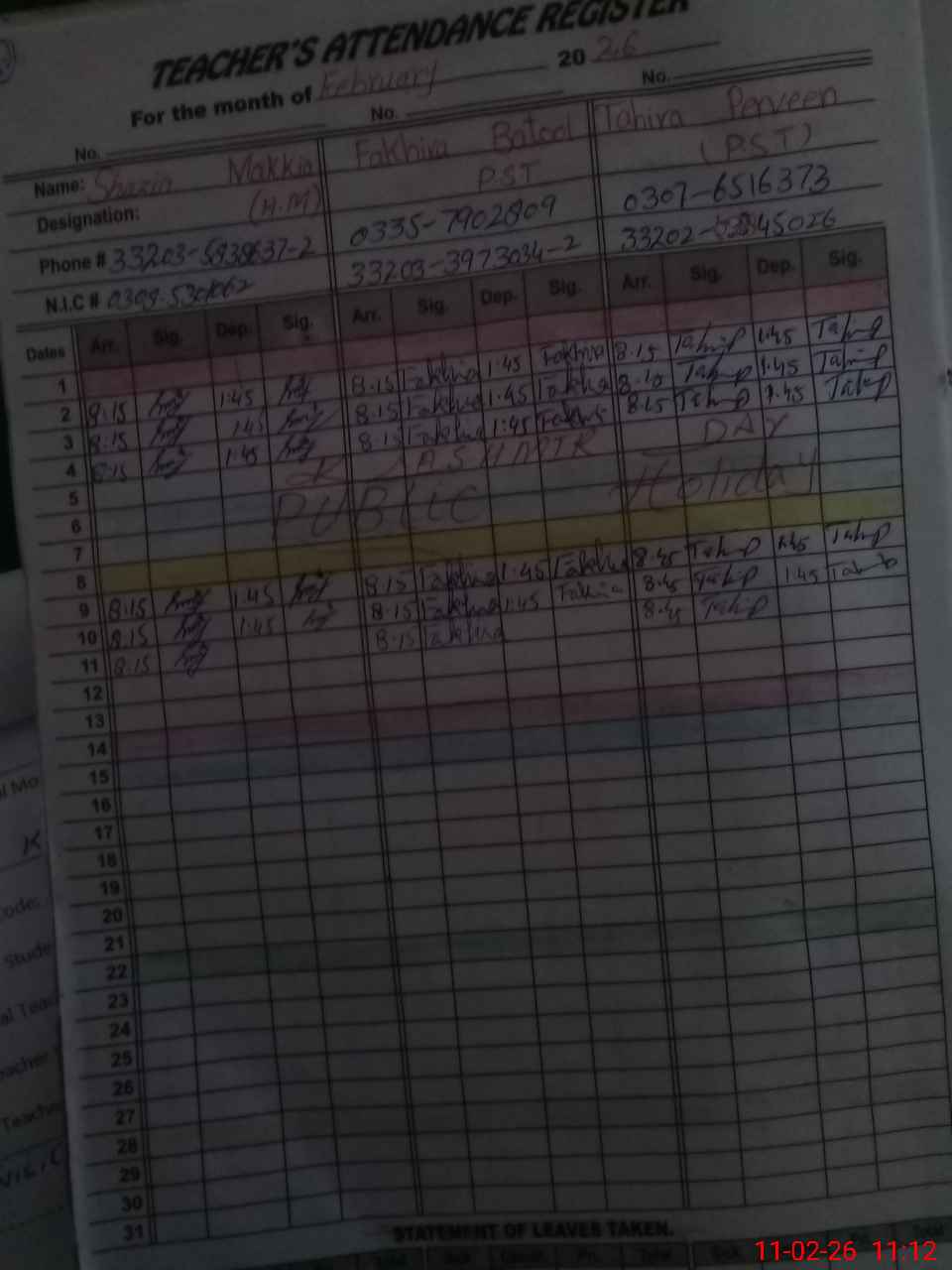 | Name: SH**** MA**** Designation: (School Headmaster's/Headmistress's) PST Phone/Cell Number: 03**** |