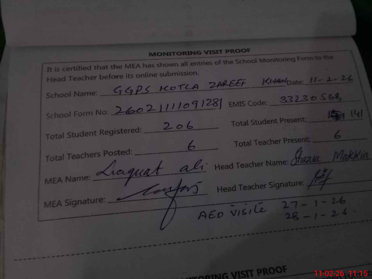 | Attendance Register | Head Teacher | MEA with School | Visit Proof |