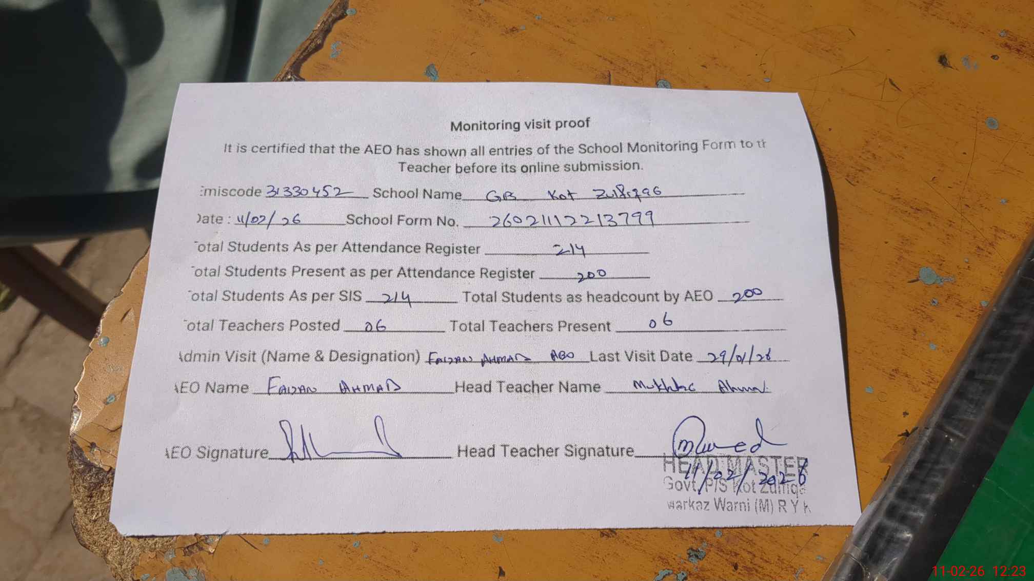 | Attendance Register | Head Teacher | MEA with School | Visit Proof |