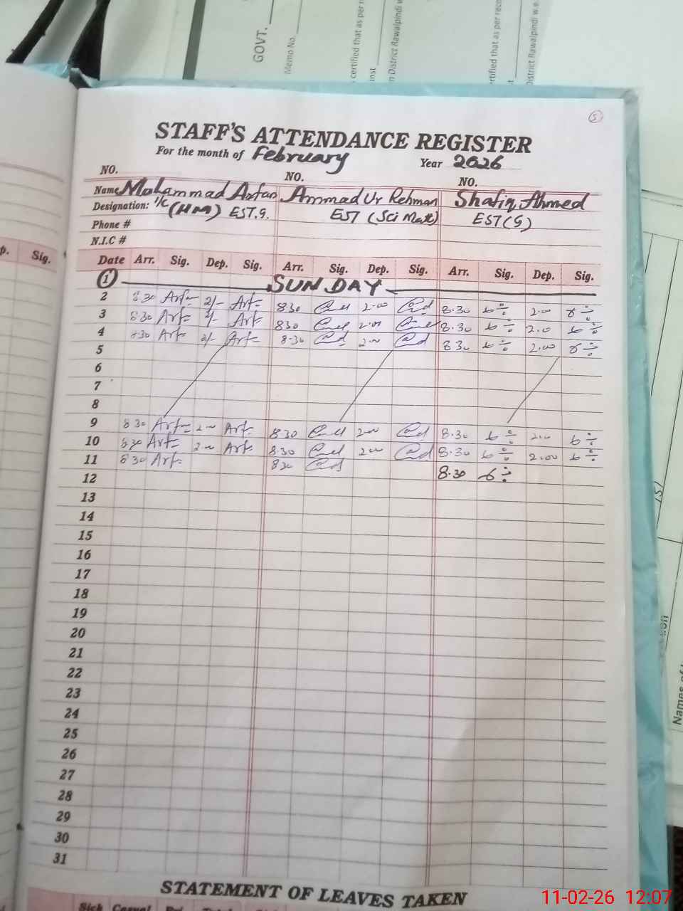 | CNIC | Full Name | Designation | R/C | Absence During Last Calender Month |