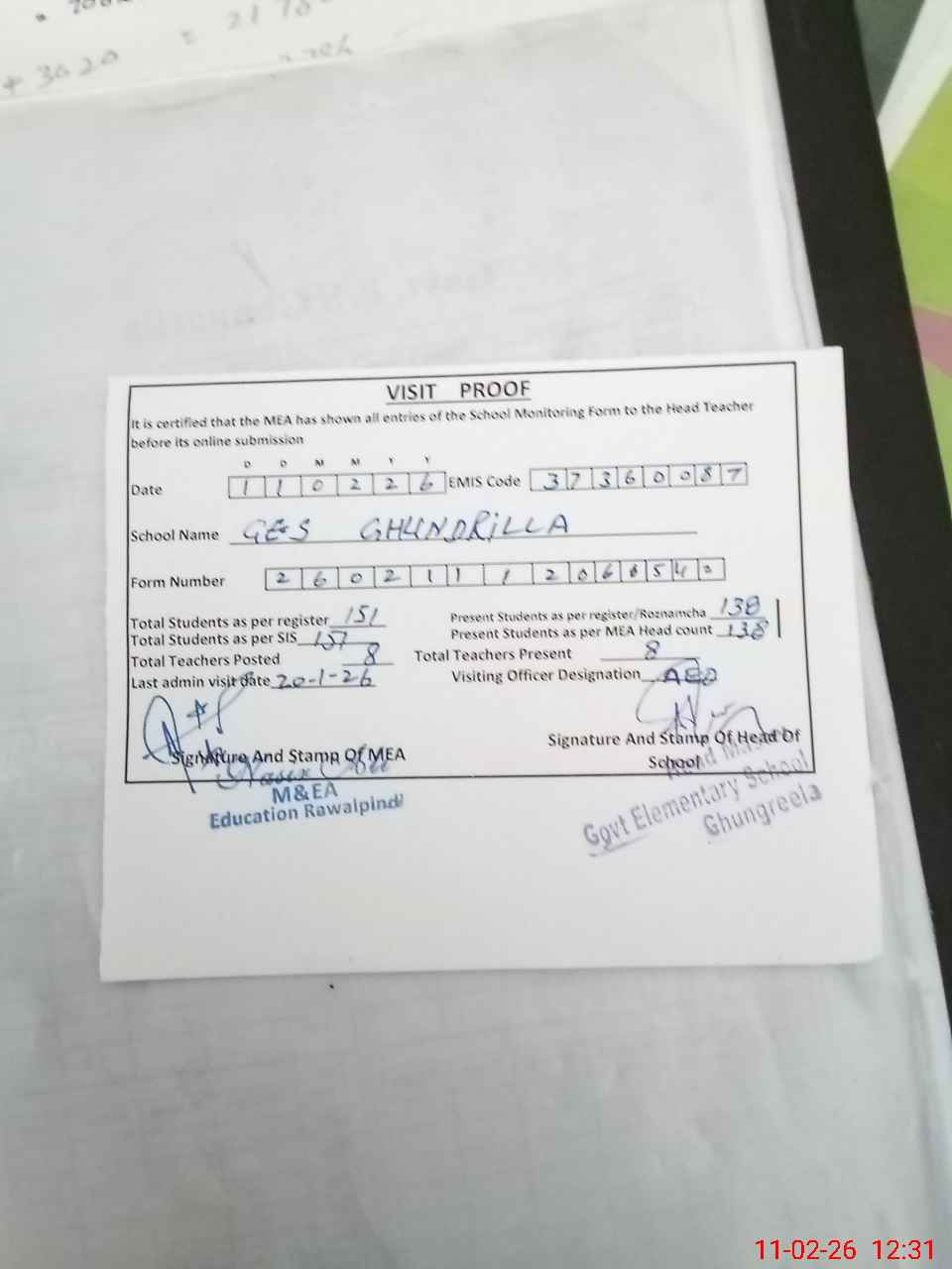 | Attendance Register | Head Teacher | MEA with School | Visit Proof |