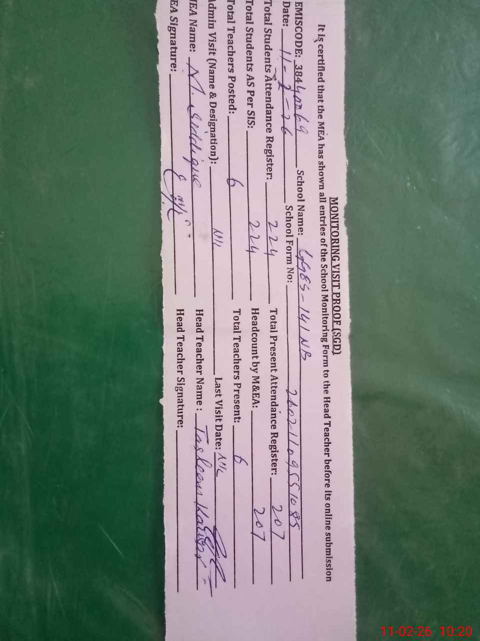 | Attendance Register | Head Teacher | MEA with School | Visit Proof |