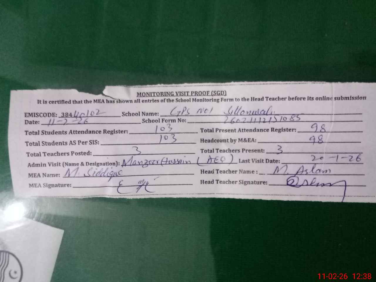 | EMIS Code: 38440102 | Name of School: GPS NO.1 TMA ROAD SILLANWALI | |||
