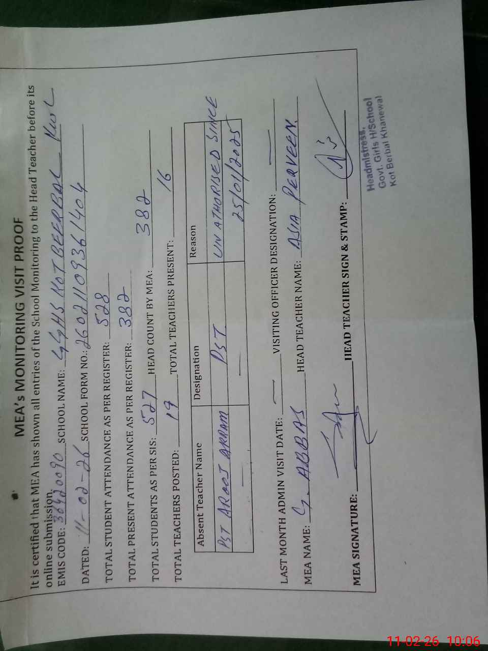 | Attendance Register | Head Teacher | MEA with School | Visit Proof |